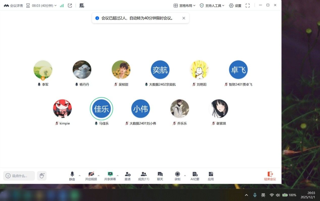 2025年12月1日20:00~21:10,李军老师与导师制学生第三次见面会在线上举行。本次会议围绕学生的学习进展和考试准备情况展开。