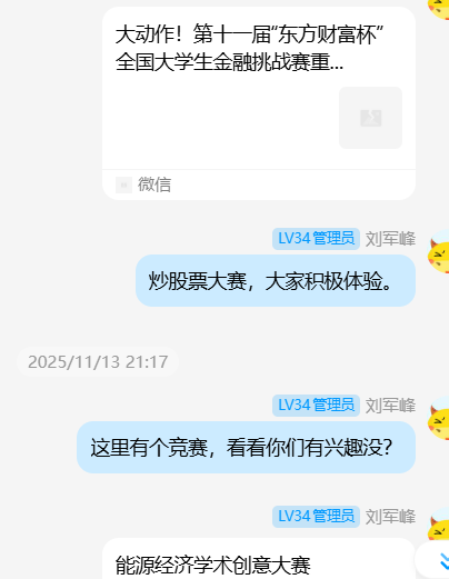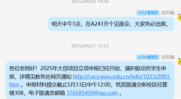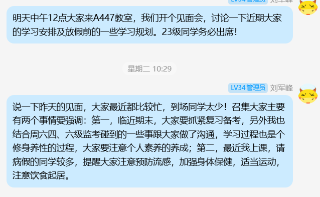 2025年11月16日下午3:00,刘军峰老师于经管人文楼208室指导导师制毕业生学生,要求其他非毕业班同学到场旁听。